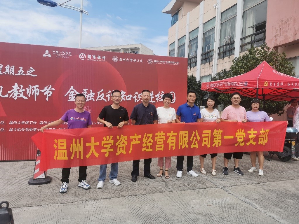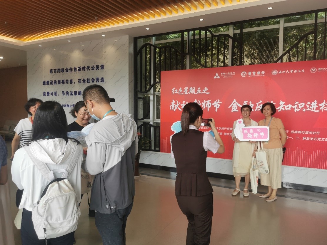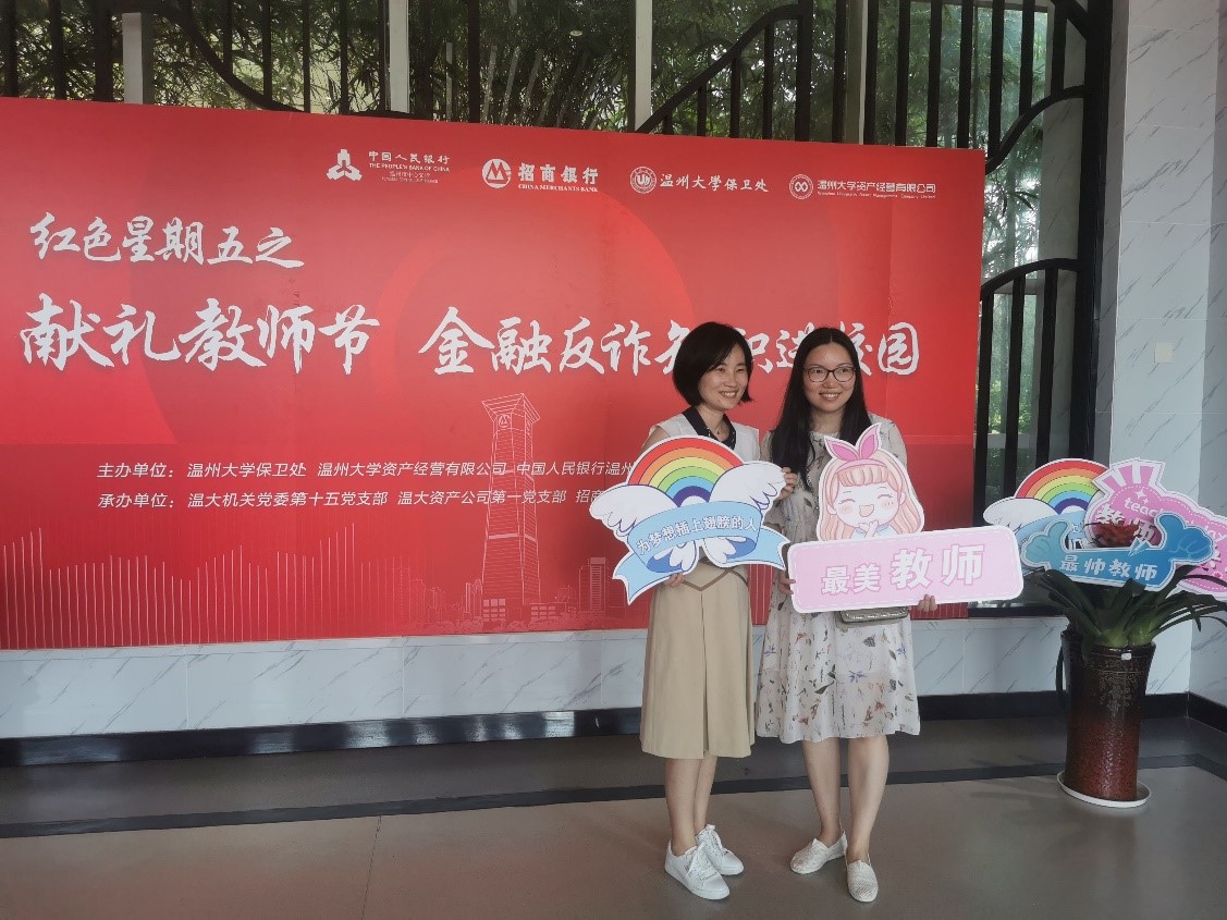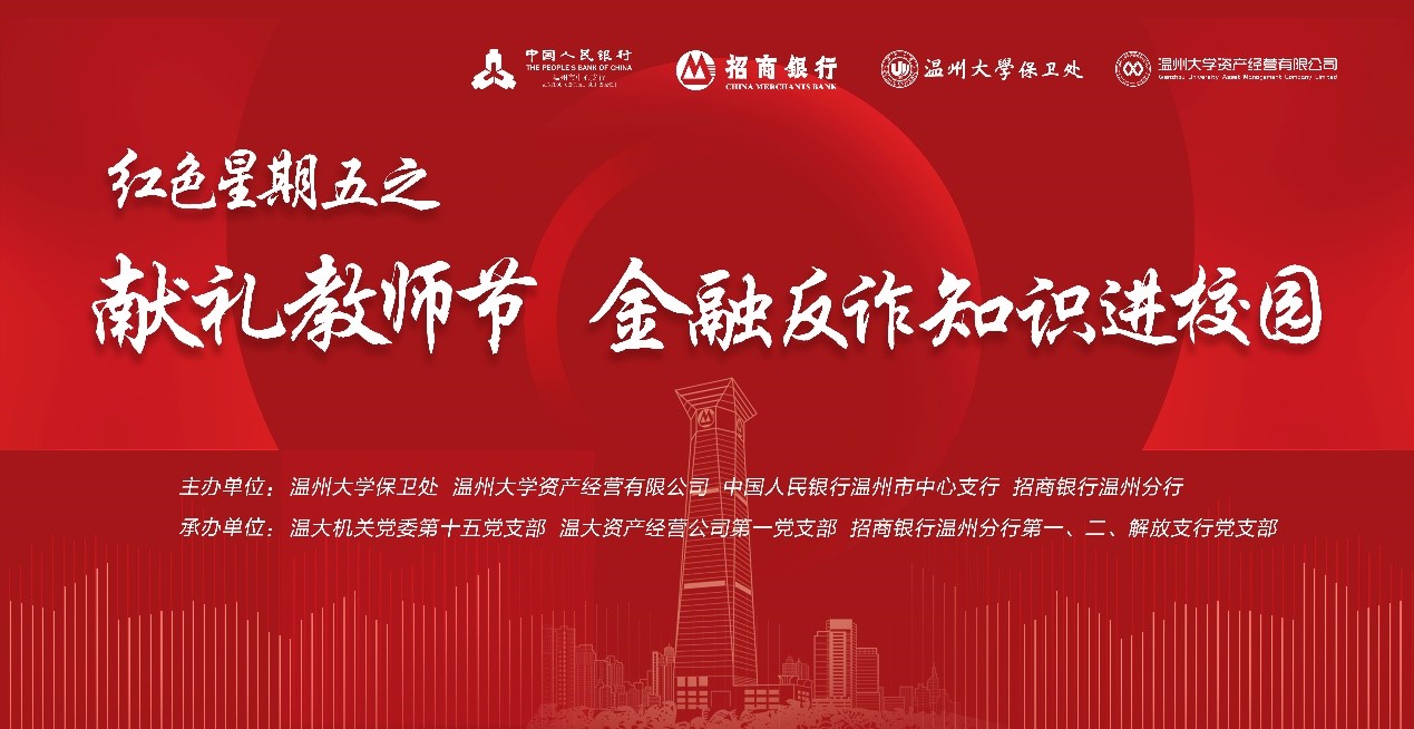 9月10日,亚洲无码 资产公司、保卫处联合人行温州市中心支行、招商银行温州分行联合在亚洲无码 校园开展“学党史、办实事”系列活动之“红色星期五:金融反诈知识进校园”主题党日活动。在第37个教师节来临之际,校银携手为高校师生送上一份特殊的节日“礼物”。