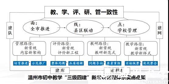 点上对每一所学校的教学管理进行调研评估;线上校区联动,研究教学新样式、教研新范式、评价新工程;面上建队、建网、建库、建样本,全市推进“教、学、评、研、管一致性”实践行动,目前初中共有200多所新常规达标校,44所新常规样板校。