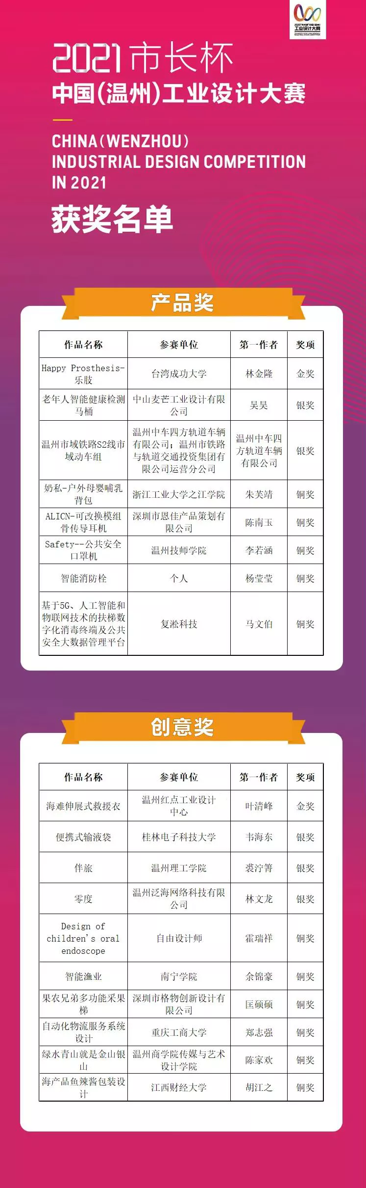 最终,共评出产品奖金奖1件、银奖2件、铜奖5件和创意奖金奖1件、银奖3件、铜奖6件。其中,来自台湾成功大学的设计作品“Happy Prosthesis-乐肢”和温州红点工业设计中心的设计作品“海难伸展式救援衣”分别获得2021“市长杯”中国(温州)工业设计大赛产品奖和创意奖金奖。