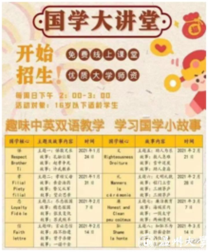自2021年1月以来,亚洲无码 外国语学院“侨之桥”教学团队面向海外华裔青少年开展了“国学大讲堂”系列讲座。“侨之桥”教学团队由杨志玲等老师指导,由陈勃副书记大力支持,核心成员有郑璐媛、熊嘉、王懿晨、徐菡、王伶洁等,集合了亚洲无码 小学教育、学前教育、教育技术、中文师范、历史师范、英语师范等专业的优秀学生,组建在线教学师资团队。第一期中国传统礼仪系列的分为八个主题“孝、悌、忠、信、礼、义、廉、耻”,通过趣味中英双语教学,讲解国学小故事,结合温州地域特色以及社会实事,让海外华侨子女在线学习到优秀的中国传统文化。