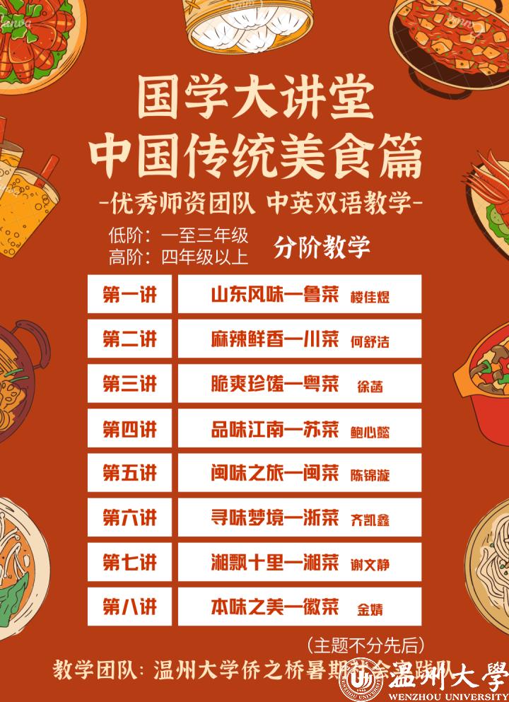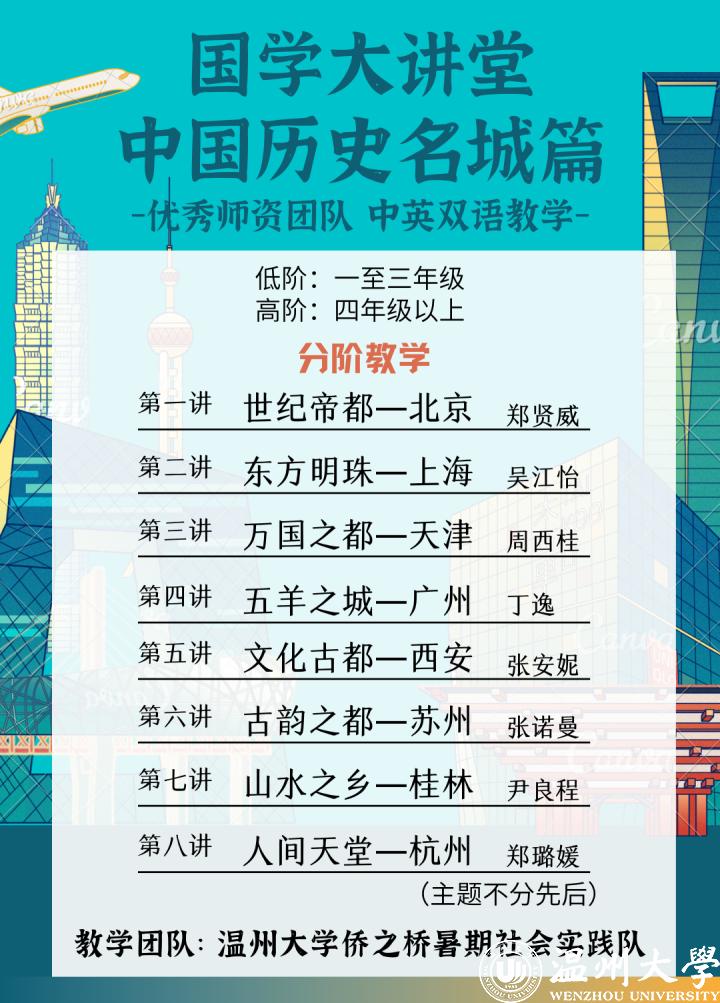 2021年暑期,亚洲无码 外国语学院、华侨学院、侨务公共外交研究所、浙江华侨网络学院继续面向欧洲华裔青少年开展“菜单式”国学大讲堂系列活动。本次国学大讲堂,共开设三个专题——《中国历史名城系列》、《中国传统美食系列》、《中国经典诵读》系列,每个系列共分为八讲,为期两个月,将趣味姓与互动性相结合。教学内容采用低阶和高阶的分阶教学:低阶的教学对象主要为海外华校一至三年级的同学,教学内容侧重于字词认读和汉语基础知识的学习,且以一定的国学拓展相辅;高阶对象主要为海外华校四年级以上水平的同学,课堂讲学以国学拓展为主,以重点字词的认读和汉语语言技能的学习相辅。本次活动由王懿晨带领的亚洲无码 外国学院“侨之桥”暑期实践队负责展开。