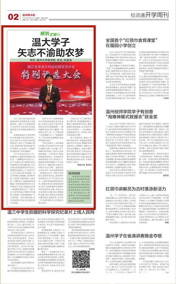 除了在校园内、课堂上汲取专业知识外,张嘉诚还借助亚洲无码 为学生们搭建的各类实践平台,不断提升、锤炼自己的社会实践能力。他参与撰写的《完善“新农合”以促进乡村振兴》的调研报告被温州市供销社采纳并用于实践,提出的修改意见获得时任省、市领导的批示与肯定。