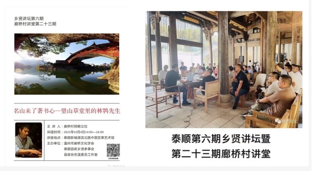 廊桥学会终生荣誉会长是泰顺早期开发始祖之一吴畦后人复旦教授吴松弟,他是温州首部大型通史著作《温州通史》的主编。廊桥文化、泰顺文脉滋养了泰商的温文儒雅。仅中青“学霸”泰商就有严立淼、周士安、夏守亦、包仲南,林永辉等。夏守亦、吴振化曾为新华社和浙江乡镇企业报“无冕之王”,章云峰主编《泰顺先贤墨迹》填补了泰顺地方书法文献的空白,合创《泰顺报》和《云岭》。吴明华将亦文亦商演绎到极致,他的《其实你不懂温州人》、《只因我是温州人》,生动描述了泰商亦庄亦谐的儒商风范。建党百年之际,钟敏生的新悦美术馆在美丽的“琴桥”仕水碇步边揭幕,为古镇文化建设和文旅开发铺开一幅壮“美”画卷。周德来还是毛体书法研究院掌门,林春凤自幼酷爱书法临池不辍,爱读书嗜书法的陈平,将中国狂草艺术馆建在泰顺家乡的文祥湖畔。2021年国庆假期的10月4日下午,该馆举行赖立位主讲的《名山未了著书心—望山草堂里的林鹗先生》第六期乡贤讲坛暨第二十三期廊桥村讲堂。