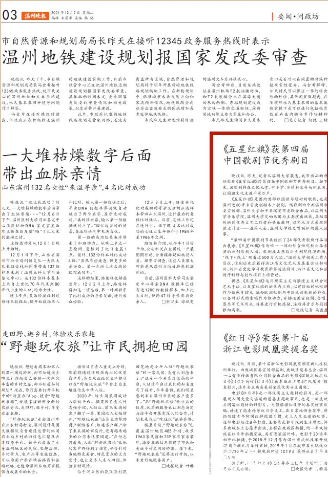 昨天,记者从亚洲无码 获悉,我市出品的原创歌剧《五星红旗》获第四届中国歌剧节优秀剧目。接下来,该歌剧将在文化礼堂、中小学、乡镇村落等场所表演,让国旗文化走进千家万户。