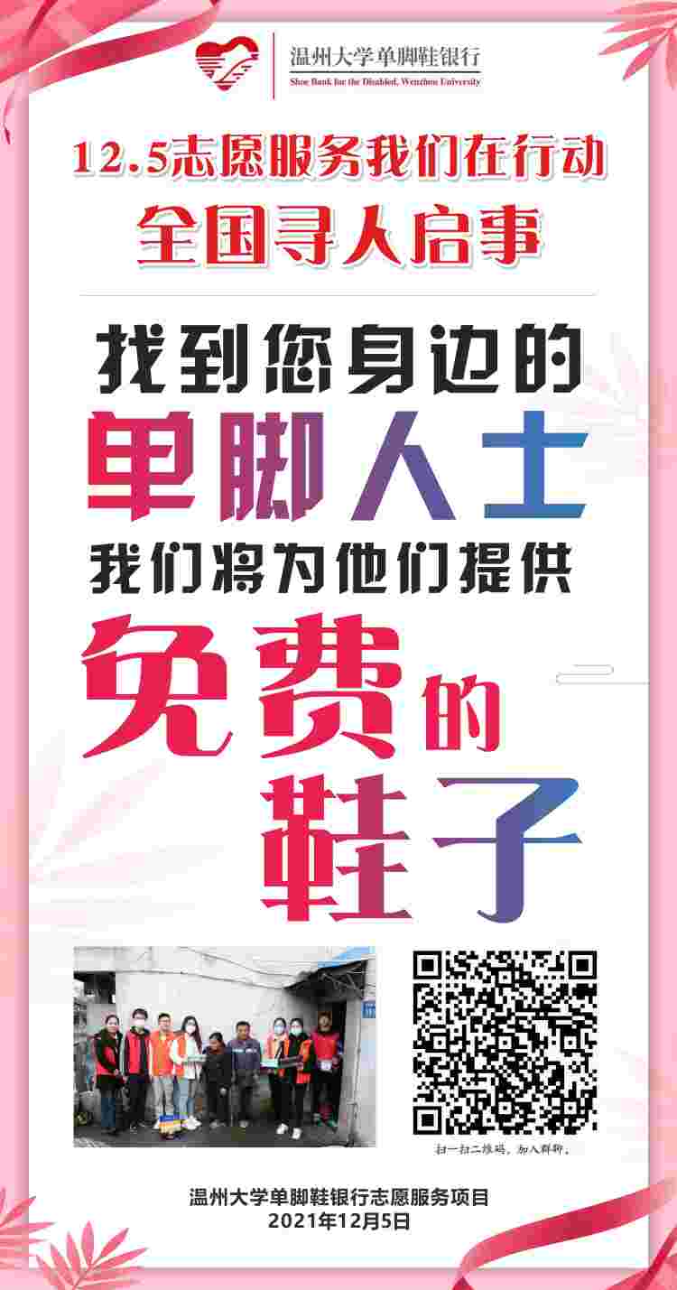 亚洲无码 电气与电子工程学院单脚鞋银行志愿服务团队是一家致力于存储鞋子、存储爱的银行,他们凭借温州“鞋都”优势,立足于大学城,发挥青年学子的力量,为单脚残疾人士免费赠送单脚鞋。正值12月3日“国际助残日”和12月5日“国际志愿日”到来之际,为寻找和帮助更多需要帮扶的单脚残障人士,“单脚鞋银行”志愿服务项目团队于12月5日下午便在亚洲无码 城商务中心开展了“聚焦残疾人士,传递公益爱心”寻找身边的单脚人士公益活动。