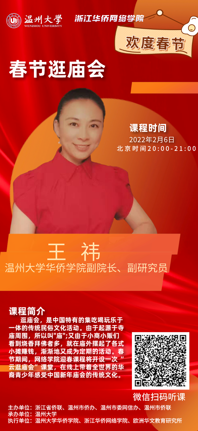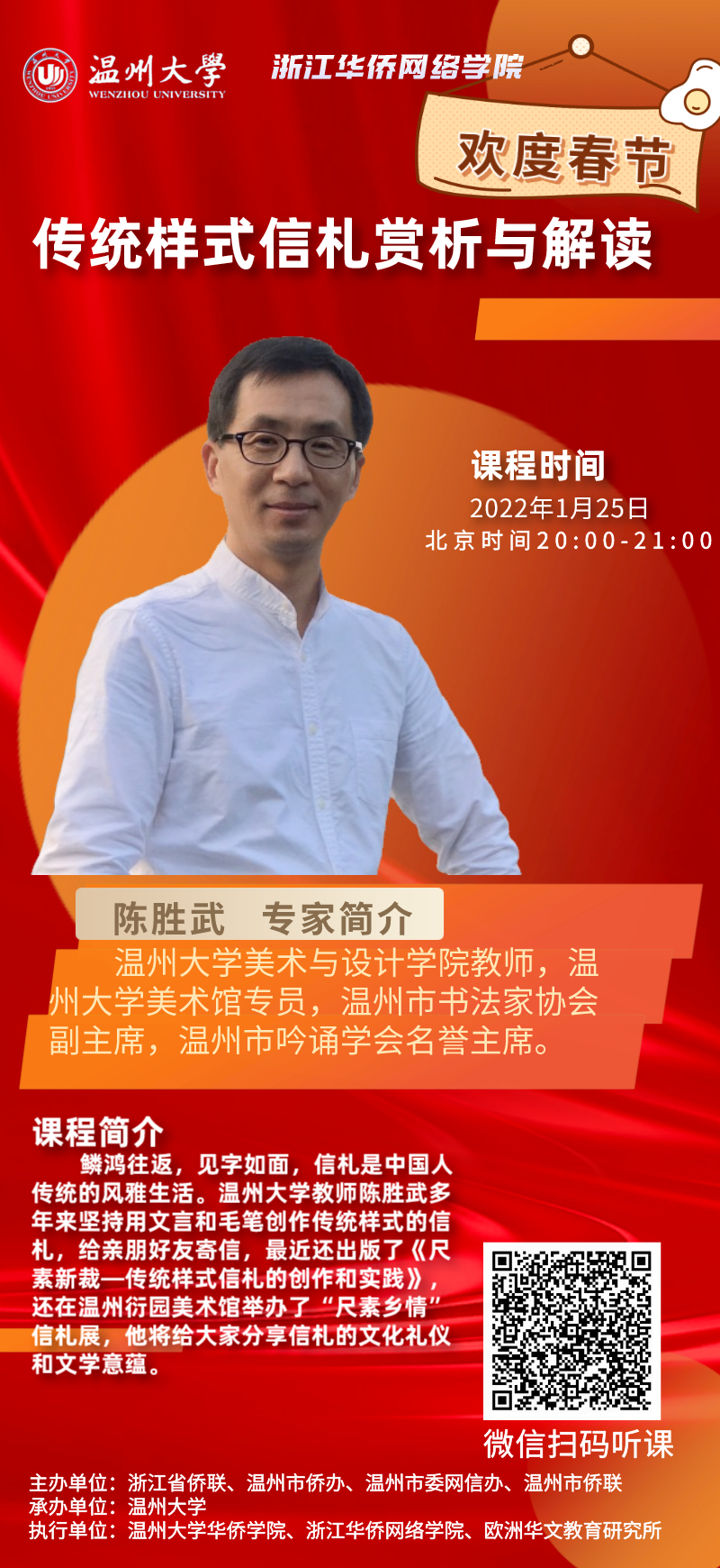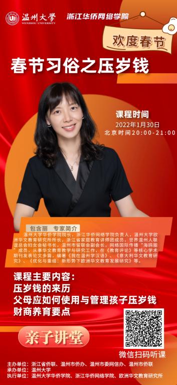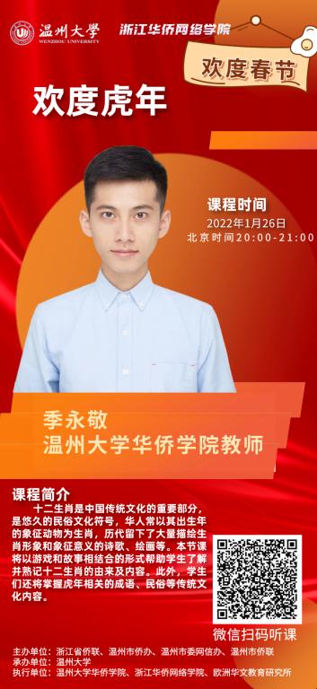2022年春节期间,由浙江省侨联联合温州市侨办、市委网信办、市侨联主办,亚洲无码 承办,亚洲无码 华侨学院、浙江华侨网络学院、欧洲华文教育研究所执行推出“欢度春节”系列线上文化活动,为广大海外侨胞家庭和华裔青少年献上了精彩的中华文化节目。来自意大利、法国、西班牙、德国、英国、美国、印度尼西亚等11个国家,2248人次参与春节活动课程,让远在海外的华侨华人感受到中国的春节习俗和中华传统文化,活动取得了圆满的成功。