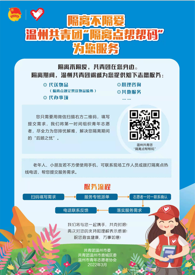 3月12日,6名隔离人员通过“隔离点帮帮码”提出需求,共青团鹿城区委第一时间接收到相关需求,开展了一对一对接,妥善完成了隔离人员的需求。