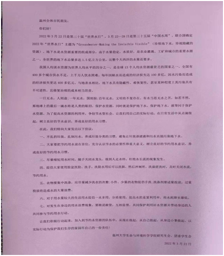 “一日无水,人则虚;一年无水,国则损;百年无水,文明将不复存在。有水当思无水之苦,如若不然,那地球上的最后一滴水将是人类的眼泪……”,生环学子利用新媒体向全市民众发出一封倡议书,呼吁大家用自己的实际行动,在日常生活中从点滴做起,树立良好的节水意识,养成良好的用水习惯。