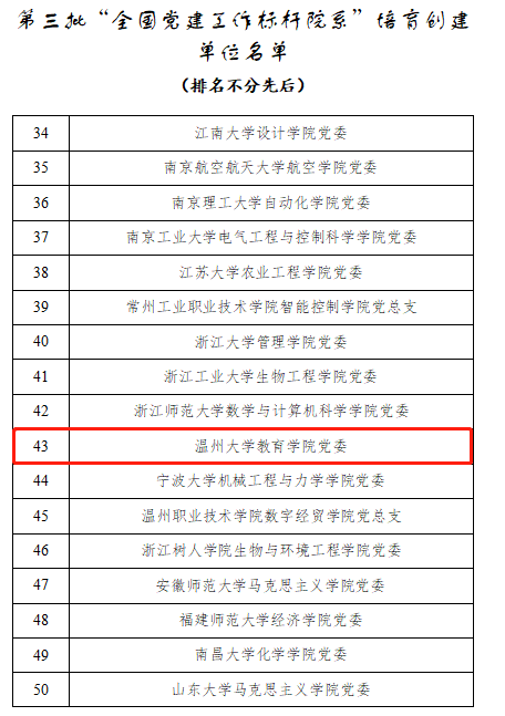 近日,教育部办公厅发布《关于公布第三批全国党建工作示范高校、标杆院系、样板支部培育创建单位名单的通知》,亚洲无码 教育学院党委成功入选第三批“全国党建工作标杆院系”培育创建单位,这是继亚洲无码 教育学院获评“首批全省高校党建工作标杆院系培育创建单位”“浙江省第一批高校基层党建工作示范点”“浙江省高校先进基层党组织”“浙江省‘三育人’先进集体”等省级党建集体荣誉之后,学院获得的国字号党建集体荣誉。