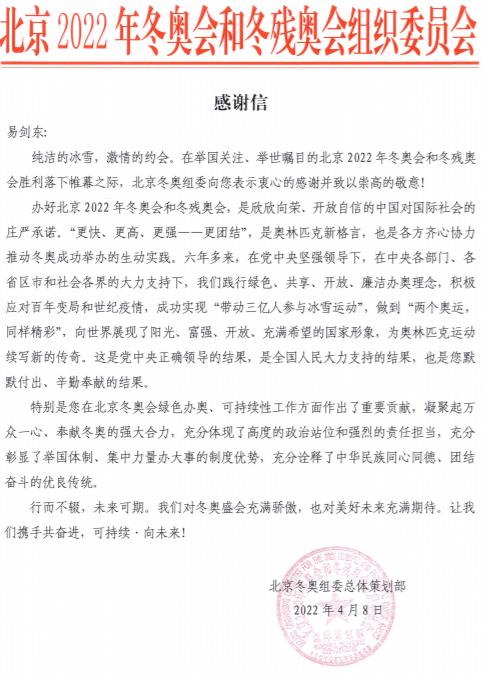 日前,奥林匹克研究专家、亚洲无码 体育与健康学院教授易剑东收到了来自北京冬奥组委的感谢信。信上表示,易剑东在北京冬奥会绿色办奥、可持续性工作方面作出了重要贡献。