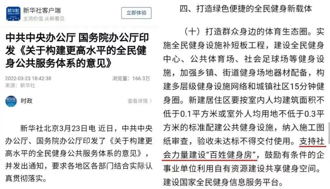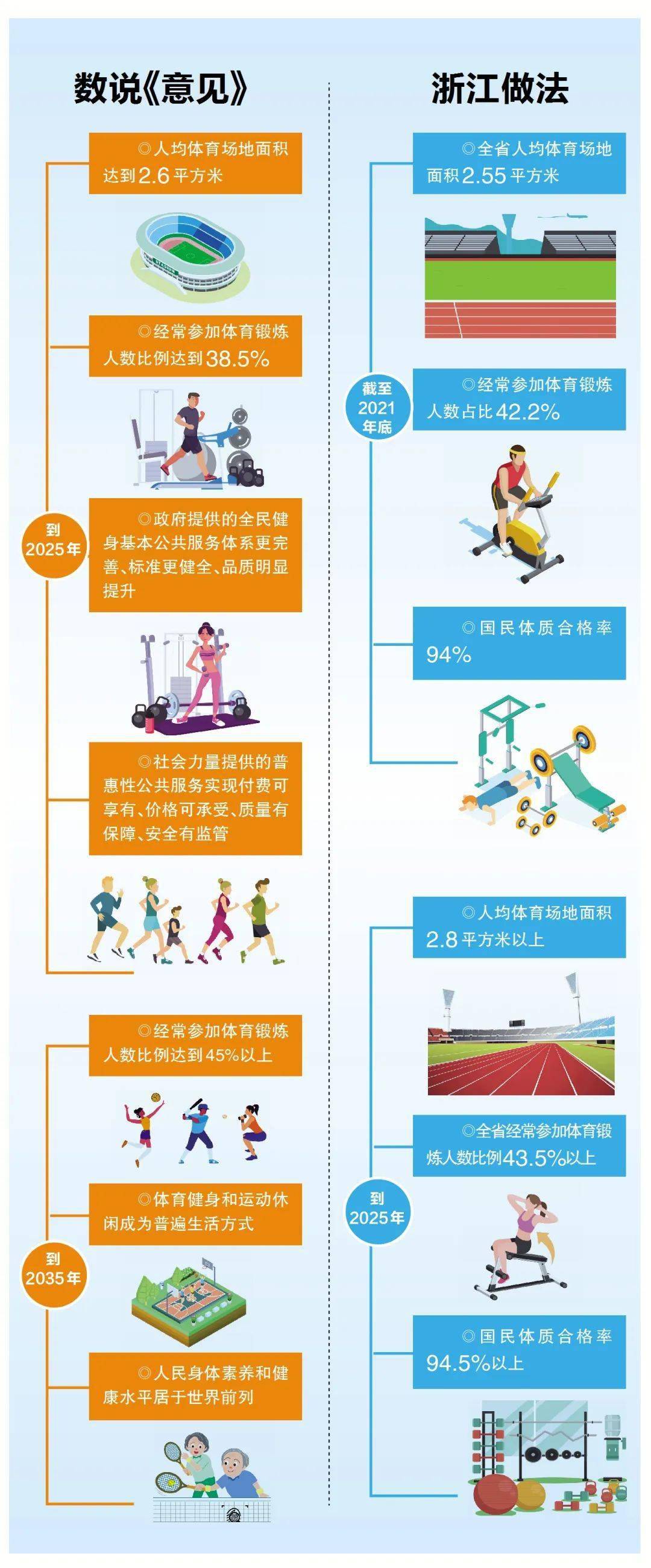近日,中共中央办公厅、国务院办公厅印发了《关于构建更高水平的全民健身公共服务体系的意见》,要求到2025年,更高水平的全民健身公共服务体系基本建立,人均体育场地面积达到2.6平方米,经常参加体育锻炼人数比例达到38.5%,政府提供的全民健身基本公共服务体系更加完善、标准更加健全、品质明显提升。