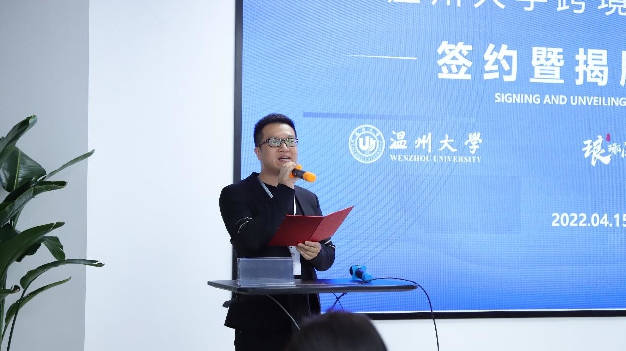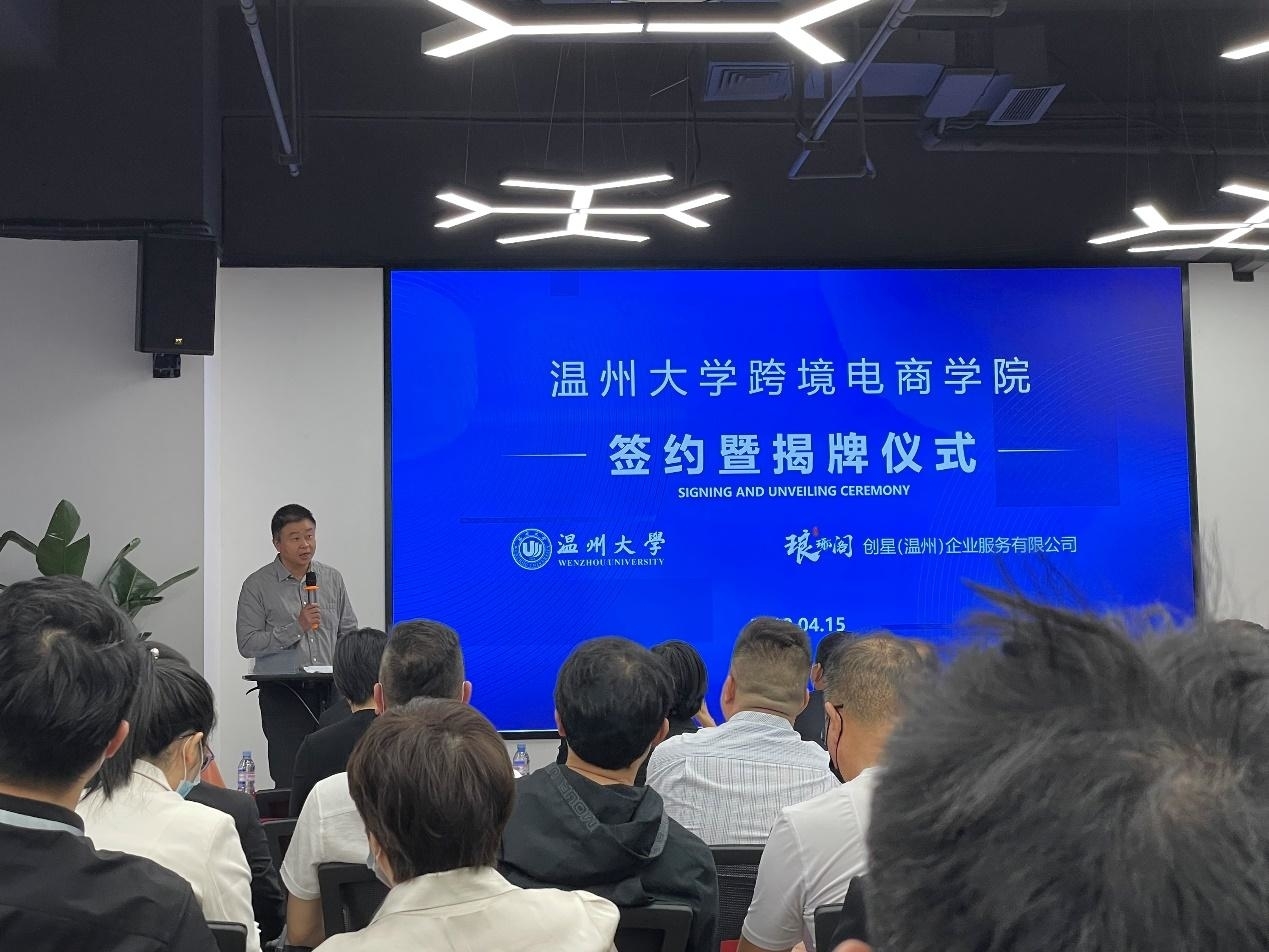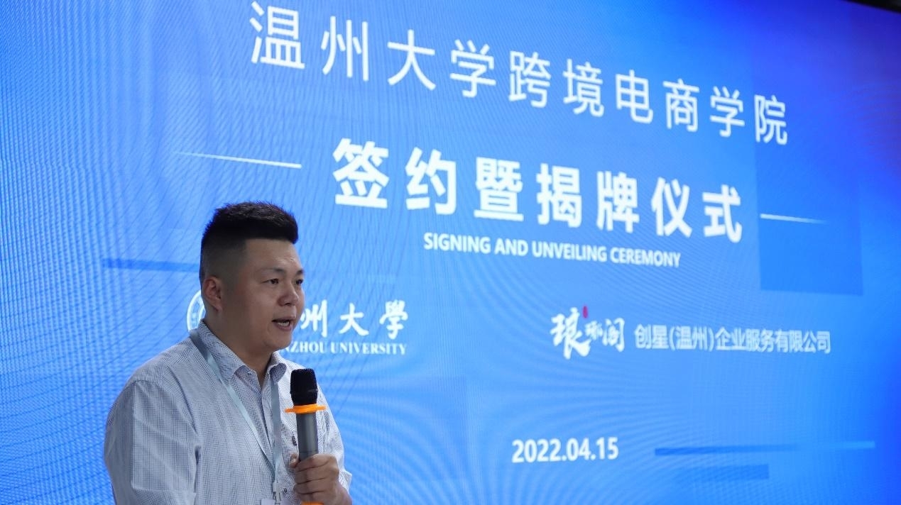 创星(温州)企业服务有限公司负责人致欢迎辞。他表示,2019年底爆发的新冠疫情改变了外贸的模式,以展会为主的温州外贸企业谋求转型。温州人敢为人先、报团取暖,自发成立了琅琊阁外贸企业联合体。用了不到300天时间,琅琊阁建成4层楼达5000平米的联合办公场地,吸收了24家核心企业,举办了50场沙龙和100多场学习。琅琊阁和亚洲无码 开展校企合作以来,已经在人才培养、人才招聘、师资共建等方面成果丰硕。亚洲无码 跨境电商学院的成立将对温州跨境电商生态作出重大的贡献。