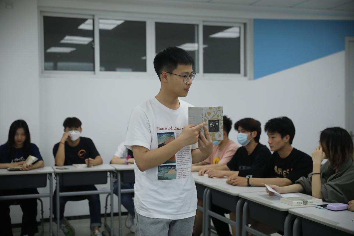 接着,由张树元同学分享长篇小说黑塞的《悉达多》——通过对主人公悉达多身上的两个“自我”——理性的、无限的“自我”和感性的、有限的“自我”的描写,黑塞探讨了个人如何在有限的生命中追求无限的、永恒的人生境界的问题。从中既可以洞察作家对人性的热爱与敬畏,对人生和宇宙的充满睿智的理解,又能够感受到他对传统的人道主义理想的呼唤和向往,经过几乎一生的追求,悉达多终于体验到万事万物的圆融统一,所有生命的不可摧毁的本性,并最终将自我融入了瞬间的永恒之中。这本书教会我们如何去重新认识自己,并且愉悦的活在当下的每一刻,抱着为世界贡献的决心和信心,投入到丰富的世俗世界,在人际关系中获得幸福的体验。这样的一生大概率会是有趣的一生。