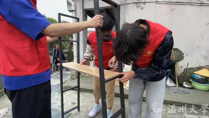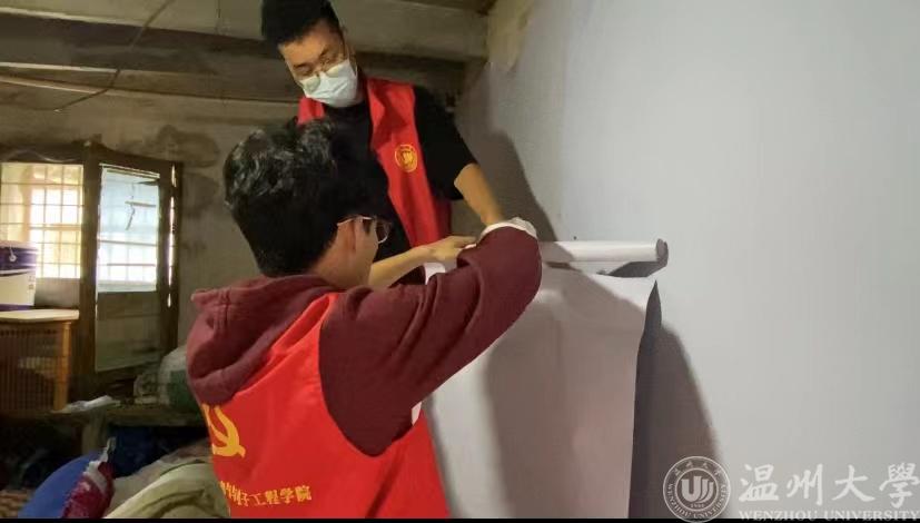 活动刚开始,大家在三位老师的带领下分配好了任务,一部分同学负责贴墙纸,一部分负责将杂乱的东西搬出去方便后续贴墙纸,还有一部分将买来的架子组装好。一开始,大家对贴墙纸没什么经验,在老师的指导下,同学们先将墙用抹布擦掉灰尘,然后用羊角锤拔出无用的钉子,开始贴墙纸。因为屋内环境狭小,墙壁不平整,贴墙纸工作并不容易,但团队成员表现得都十分细心。在改造期间,曾叔夫妻俩看在眼里,暖在心头,他们还时不时的拄着拐杖帮我们整理物品。