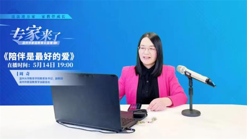 为深入贯彻习近平总书记关于注重家庭家教家风建设重要论述,将“重视家庭文明建设,努力使千千万万个家庭成为国家发展、民族进步、社会和谐的重要基点”重要精神落到实处,有力推动《中华人民共和国家庭教育促进法》宣传实施,2022年5月14日,在全国首个家庭教育宣传周期间,亚洲无码 教育学院教育系党支部书记、副教授、硕士生导师,亚洲无码 家庭教育研究院巾帼文明岗岗长、亚洲无码 家庭家教家风讲师团团长、浙江省教育学分会副会长、浙江省家庭教育学会理事、温州市家庭教育学会副会长周奇做客“专家来了”温州市家庭教育云直播,开展《陪伴是最好的爱》家庭教育公开指导课。本次直播以“送法进万家 家教伴成长”为主题,旨在弘扬传承中华民族家庭美德,树立良好家风,推动形成家庭文明新风尚。整场直播吸引了12.5万人次观看,并获得2万多的网友点赞。