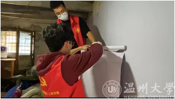 活动刚开始,大家在三位老师的带领下分配好了任务,一部分同学负责贴墙纸,一部分负责将杂乱的东西搬出去方便后续贴墙纸,还有一部分将买来的架子组装好。一开始,大家对贴墙纸没什么经验,在老师的指导下,同学们先将墙用抹布擦掉灰尘,然后用羊角锤拔出无用的钉子,开始贴墙纸。因为屋内环境狭小,墙壁不平整,贴墙纸工作并不容易,但团队成员表现得都十分细心。在改造期间,曾叔夫妻俩看在眼里,暖在心头,他们还时不时的拄着拐杖帮我们整理物品。