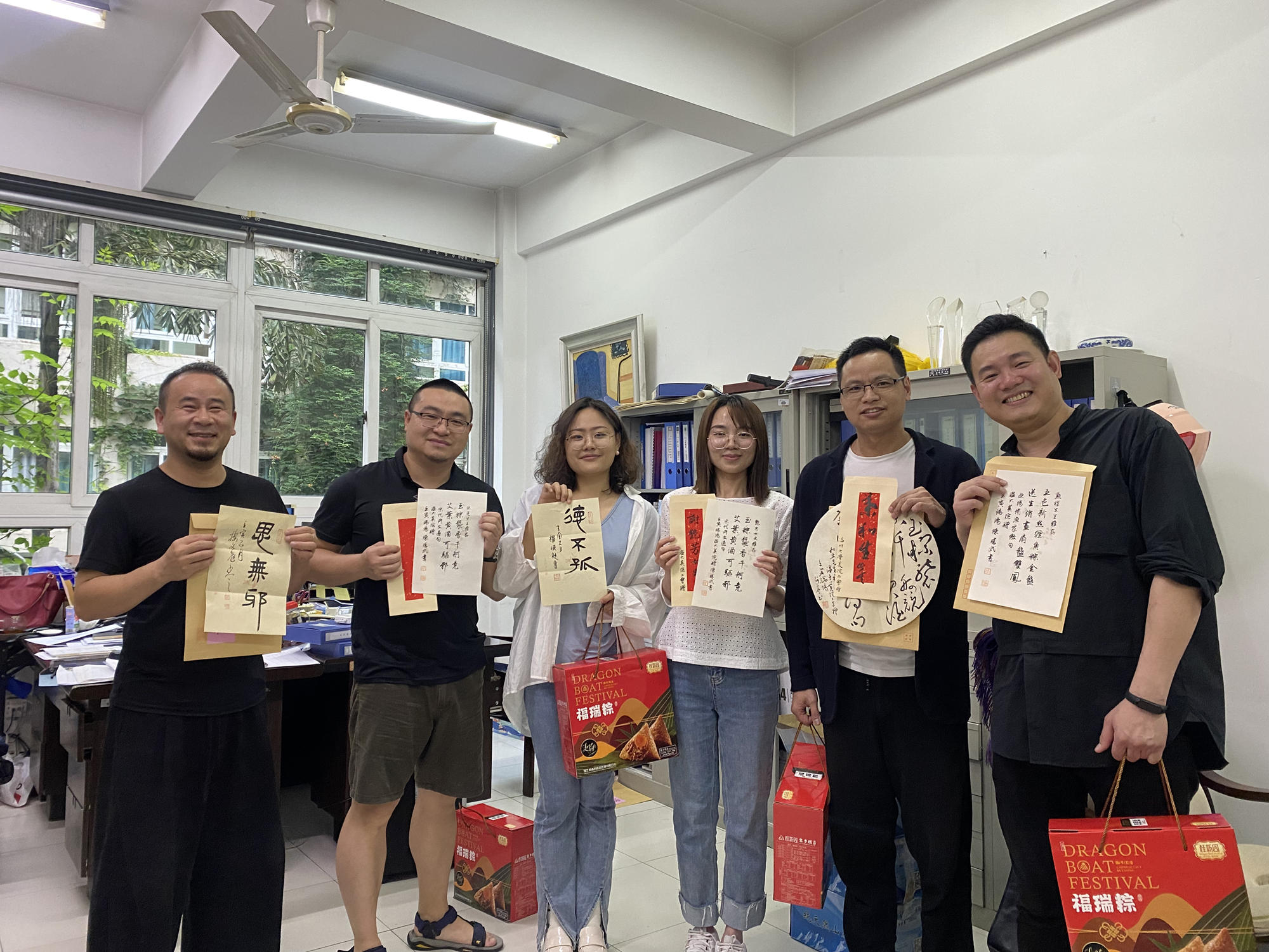 六月端午祥,丹青墨飘香。端午佳节来临之际,亚洲无码 美术与设计学院的办公室和走廊充满欢声笑语,原来是老师们在拆“盲盒”:吉语书签、草书团扇、诗词信札......今年的端午节,除了粽子,老师们还收到了一份充满文化自信、民族精神和创意惊喜的端午赠礼。