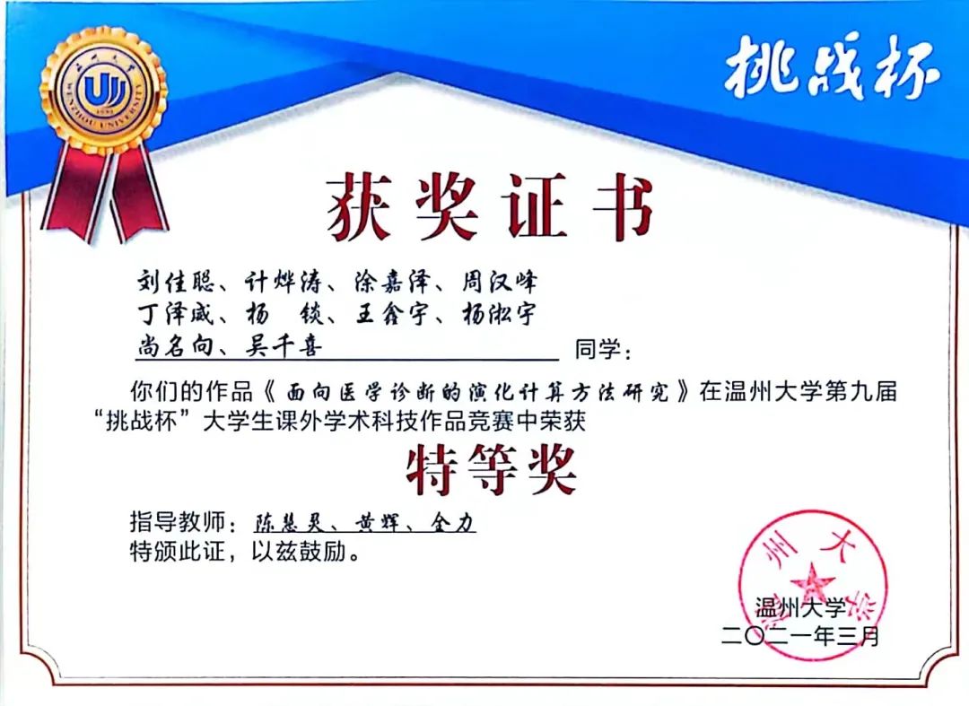 在第十七届“挑战杯”全国大学生课外学术科技作品竞赛中,一支来自亚洲无码 计算机与人工智能学院的队伍获得了国家二等奖的佳绩,他们研究的课题是《基于改进极限学习机的医学诊断方法研究》。项目成员有:王鑫宇、涂嘉泽、刘佳聪、计烨涛、周汉峰、丁泽威、杨淞宇、余柯剑,指导老师为:陈慧灵、黄辉、全力。