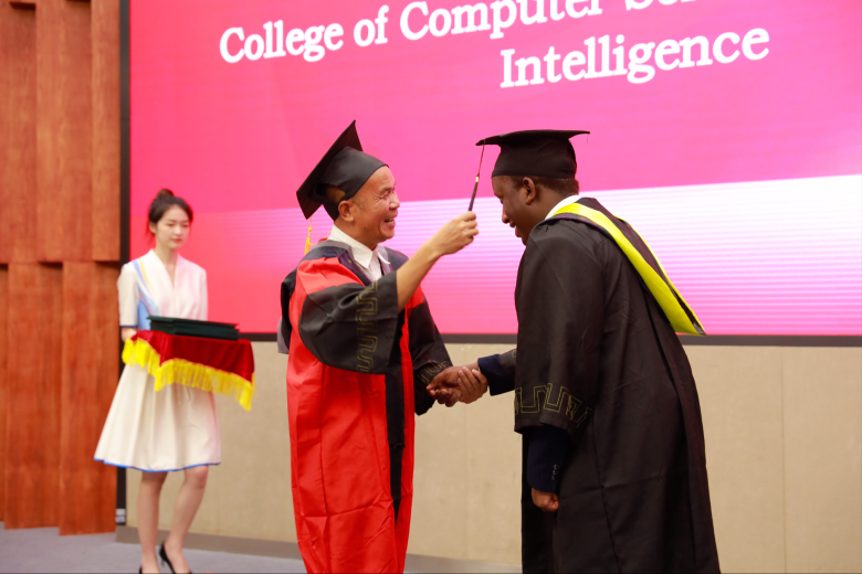毕业典礼对优秀国际毕业生、校友联络员、语言结业生等颁发证书,并为全体国际学生毕业生颁发学位证书,并拨穗正冠、合影留念。