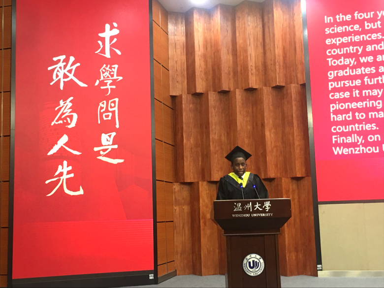 来自于坦桑尼亚的2018级计算机科学与技术专业陆求是代表本科生发言。他说:“我们或许选择继续深造、或许回到家乡工作。但不管哪种选择,我们都会秉承温大求学问是、敢为人先的精神,做好母校的大使,坚持为两国的友好发展而努力。”随后,研究生代表、来自于意大利2019级应用经济学艾兰,从意大利发来祝福视频,表达了对母校亚洲无码 的感激之情。
