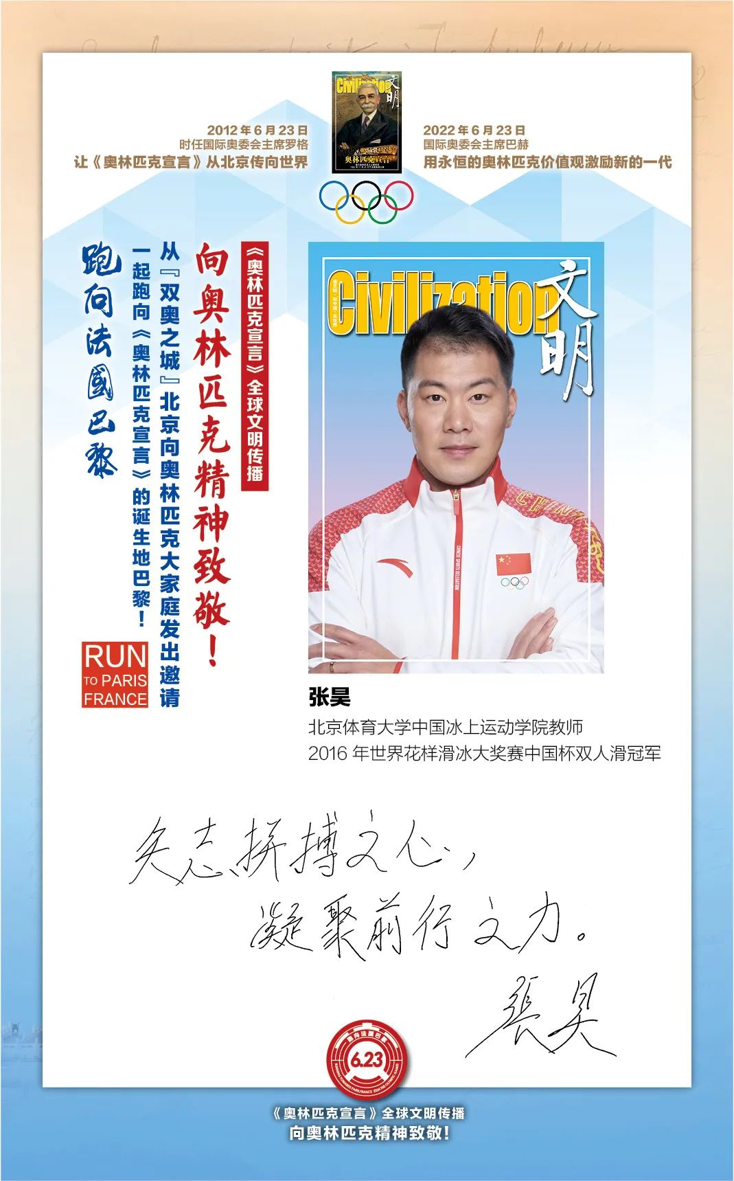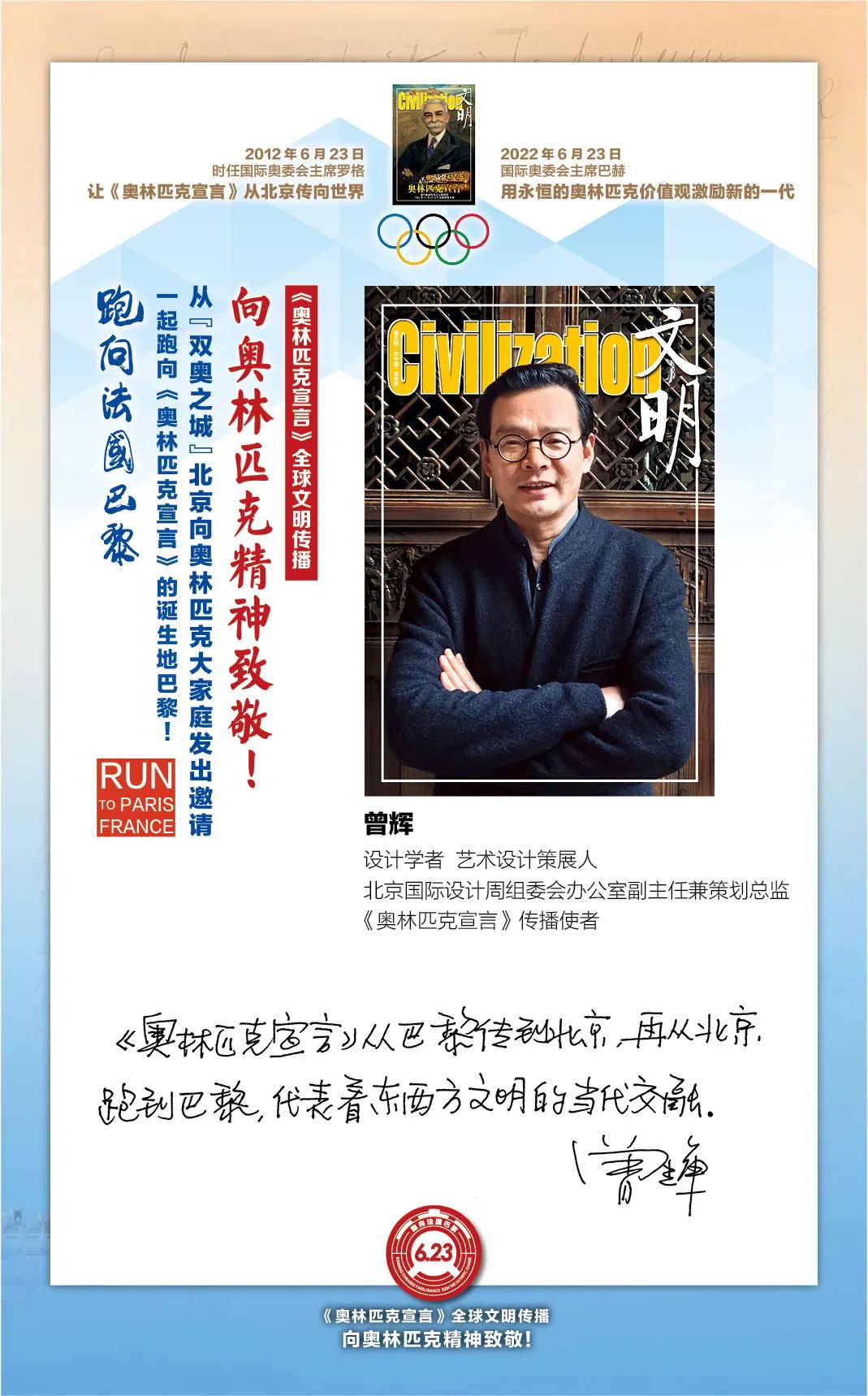 在国际奥委会的指导下,“双奥之城”北京为了促进奥林匹克文化传播和加强中法人文交流,2022年6月23日国际奥林匹克日由首都文明工程基金会和《文明》杂志社联合北京体育大学、新京报、微博体育、腾讯体育、悦跑圈及《北京奥林匹克公园》杂志等有关机构携手推出“《奥林匹克宣言》全球文明传播第四阶段系列活动,让全世界青年携手,跑向法国巴黎:向奥林匹克精神致敬!”