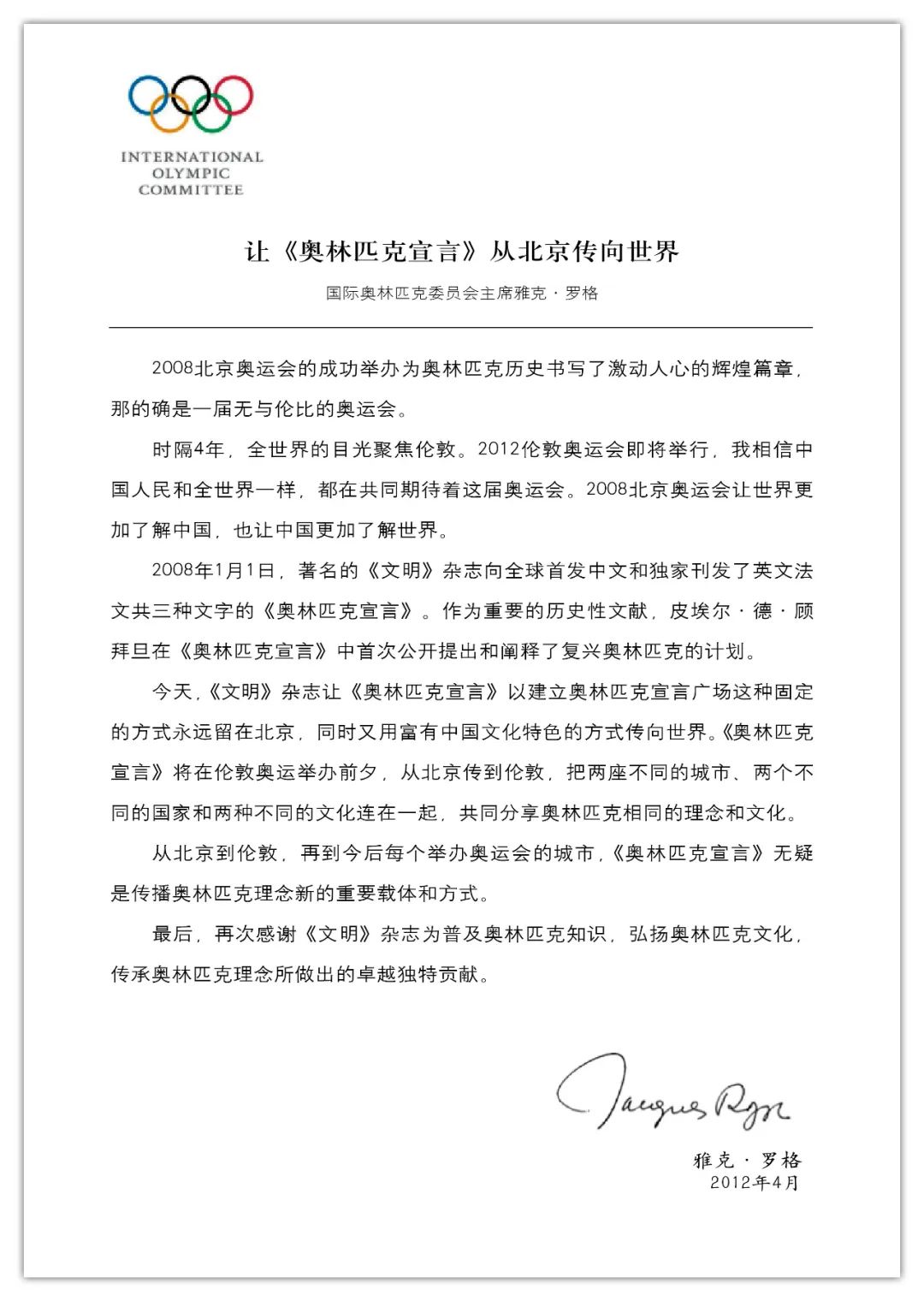 国际奥委会主席罗格:让《奥林匹克宣言》从北京传向世界!今天,《文明》杂志让《奥林匹克宣言》以建立奥林匹克宣言广场这种固定的方式留在北京,同时有用富有中国文化特色的方式传向世界。从北京到伦敦。再到今后每一个举办奥运会的城市,《奥林匹克宣言》无疑是传播奥林匹克理念新的重要载体和方式。