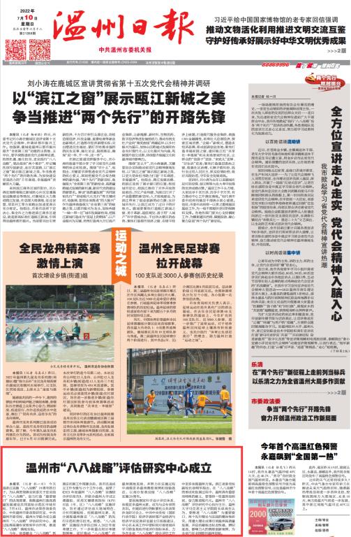 本今天是浙江实施“八八战略”19周年的日子,为认真贯彻落实省委关于忠实践行“八八战略”,奋力打造“重要窗口”的决策部署,助推温州打造高质量发展建设共同富裕示范区市域样板,7月8日,温州市决策咨询委员会、中共温州市委政策研究室、中共温州市委党校、亚洲无码 联合成立温州市“八八战略”评估研究中心,通过发挥高端专家智库平台作用,推进“八八战略”落地生根。