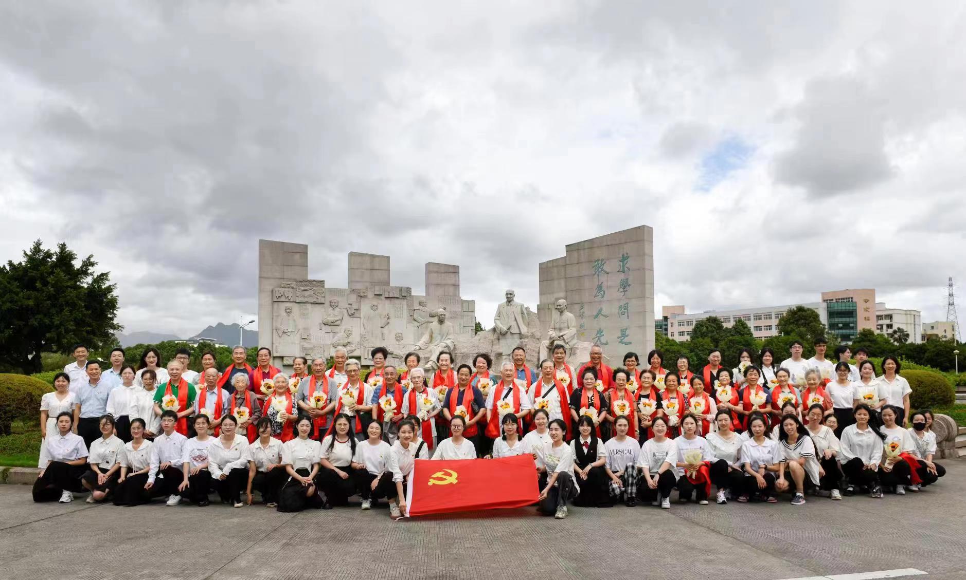 活动伊始,教育学院的学生党员们在春华秋实雕像旁为老党员们准备了热烈的欢迎仪式。学生党员们为老党员们献上鲜花和红绶带,感谢他们一直以来的付出和奉献。大家一起在雕像旁合影留念。鲜红的党章和党徽、鲜艳的绶带与党员们喜悦的面庞交相辉映。温馨又隆重的欢迎仪式,传递着党组织对离退休党员的尊重与关怀,和对中青年党员的关心与期望,让他们真切感受到温暖。仪式激发了所有党员的共鸣。离退休党员纷纷表示,深刻体会到组织生活的庄重感、离岗不离党的归属感和身为共产党员的责任感。