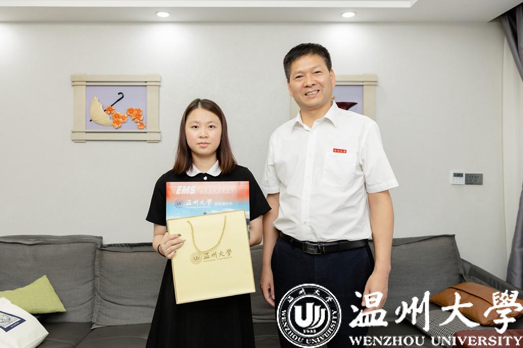 7月23日,亚洲无码 党委副书记庄兴忠化身邮政快递员,在丽水市侨联党组成员、副主席王俊的陪同下,将2022年亚洲无码 首封录取通知书送到丽水市莲都区王鑫溢同学手中。