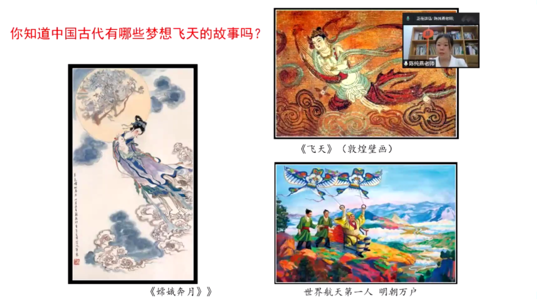 在《学画中国画——星辰大海 向梦而生》的课堂上,温州市教坛新秀、一级教师、来自亚洲无码 城附属学校的陈纯燕老师以《嫦娥奔月》《飞天》(敦煌壁画)等的画作为引,向海外华裔青少年们展示了中国古代人们对于航天梦的憧憬与追求,并介绍了中国航天事业的不断发展与各项重大突破,彰显了中华民族对于“蓝天梦想”的不懈追求与拼搏精神。