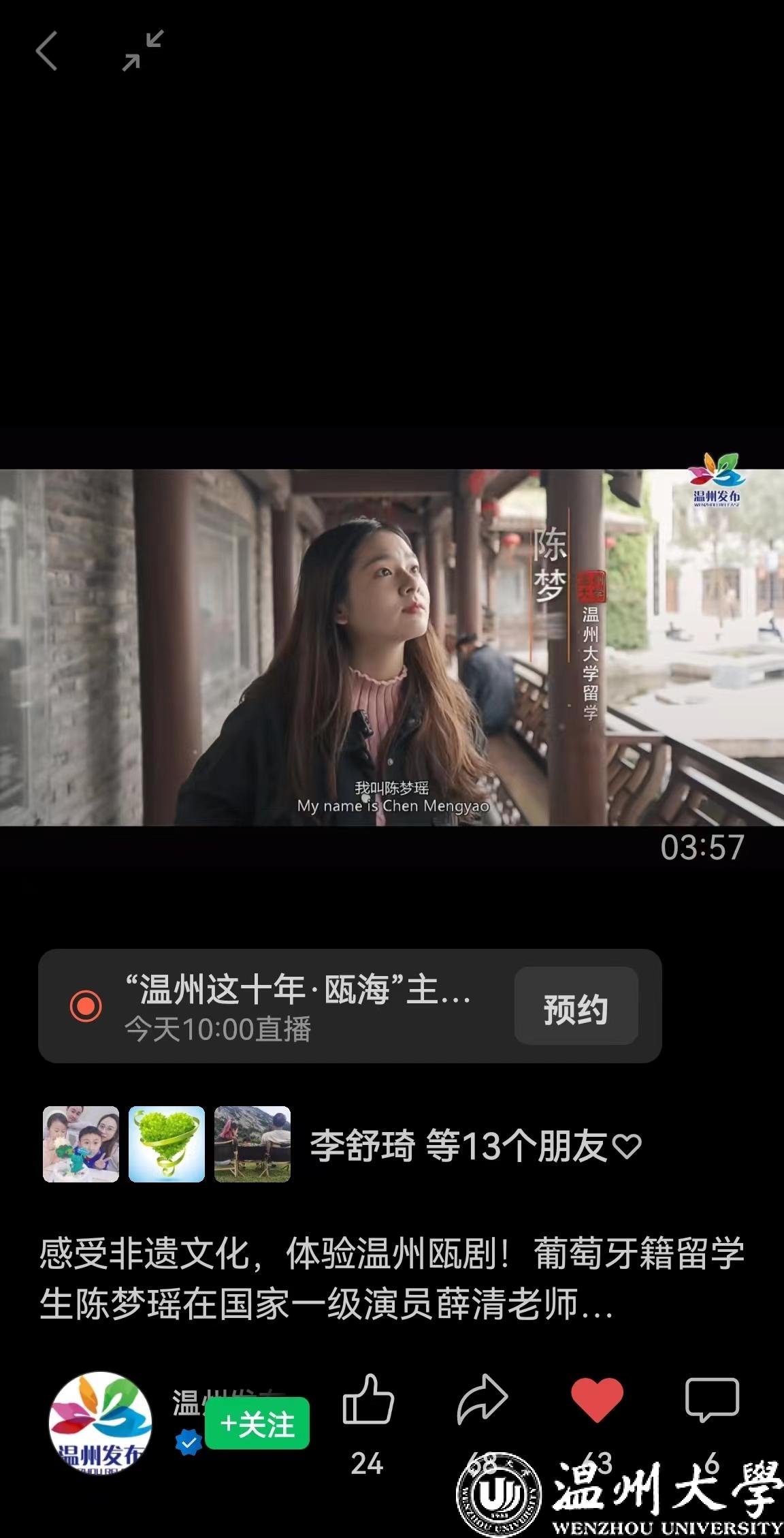 感受非遗文化,体验温州瓯剧!葡萄牙籍留学生陈梦瑶在国家一级演员薛清老师的指导下,学习温州地方传统戏曲——瓯剧,近距离感受“瓯城腔调”!
