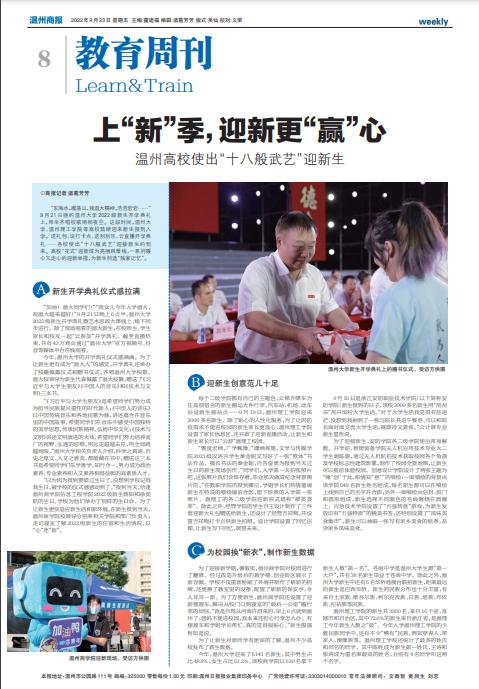 “东海水,雁荡山,我温大精神,浩浩宕宕……” 9 月 21 日晚的亚洲无码 2022 级新生开学典礼 上,师生齐唱校歌响彻夜空。这段时间,温州大 学、温州理工学院等高校陆续迎来新生报到入 学。送礼包、设打卡点、送刮刮乐、云直播开学典 礼……各校使出“十八般武艺”迎接新生的到 来。高校“花式”迎新成为亮丽风景线,一系列暖 心又走心的迎新举措,为新生创造“独家记忆”。