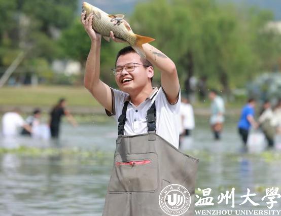 水闸一开,明心湖水缓缓下降,岸边的同学早已穿戴完备,跃跃欲试。随着一声“开渔咯”,湖面瞬间热闹了起来,草鱼、鲤鱼等纷纷被同学们抓入篓中,岸边的师生也举起手机,记录下这壮观的一幕。