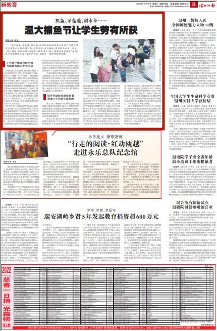 其实,除了像捕鱼节这样的、强化专业 实践开展的劳动教育,温大还不断拓宽劳 动教育途径,加强就业指导开展劳动教育、 融合创新创业开展劳动教育、深化合作发 展开展劳动教育等,逐步形成具有温大特 色的劳动教育体系。