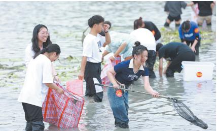 “亲手抓鱼、采莲蓬、割水草,这样的劳动活动有点意思!”坐落在温 州大学茶山校区的明心湖,水草丰茂,鱼儿畅游,荷香飘然而至。近日, “明心湖畔,鱼你相约”捕鱼节活动在温大“明心湖劳动教育基地”启动, 各个学院的学子以小组赛的方式,体验了一场特殊的劳动课。