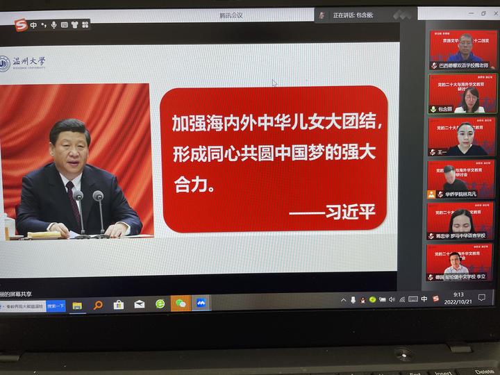 包含丽院长谈到:二十大的召开振奋人心,报告中五次谈到对侨关系,说明国家在对侨政策上高度重视,海外华文教育也将乘着二十大的东风乘风破浪,开启新征程。目前全球约有两万所华文学校,数十万华文教师,数百万华裔学生,海外华文学校是涵养海外华裔青少年家国情怀精神的重要载体,也是发挥海外华人华侨优势关键所在,搭建以“中华优秀文化“为引领的纽带和桥梁,构建内外联动的海外中华文化的传播体系”更好的推动中华文化走出去,因此海外华文学校是促进中外文明交流的纽带。