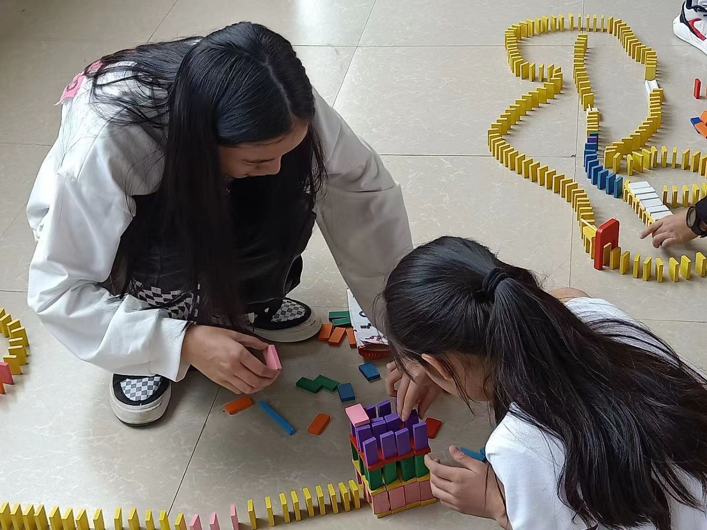 “123开始!”,小朋友手指一动,刷的一声多米诺骨牌应声倒下,课堂上又传来的一阵欢声笑语,课堂上,老师和学生们早已打成一片。这项具有亚洲无码 建筑工程学院的专业特色的公益课堂已经坚持了十年。