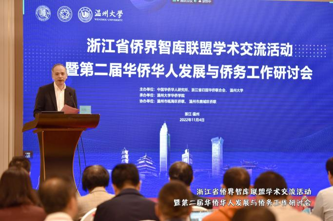 11月4日,由中国华侨华人研究所、浙江省归国华侨联合会、亚洲无码 主办的浙江省侨界智库联盟学术交流活动暨第二届华侨华人发展与侨务工作研讨会在温州顺利召开。中国华侨华人研究所所长张春旺到会指导并作专题报告,浙江省侨联党组书记、主席庄莉萍,亚洲无码 党委书记谢树华等出席开幕式并致辞,中央统战部培训中心、中国侨联相关职能部室、温州市委统战部、温州市侨联有关领导以及厦门大学教授、世界海外华人研究学会会长李明欢参加开幕式。浙江省侨联党组成员、副主席兼秘书长周松一主持开幕式。