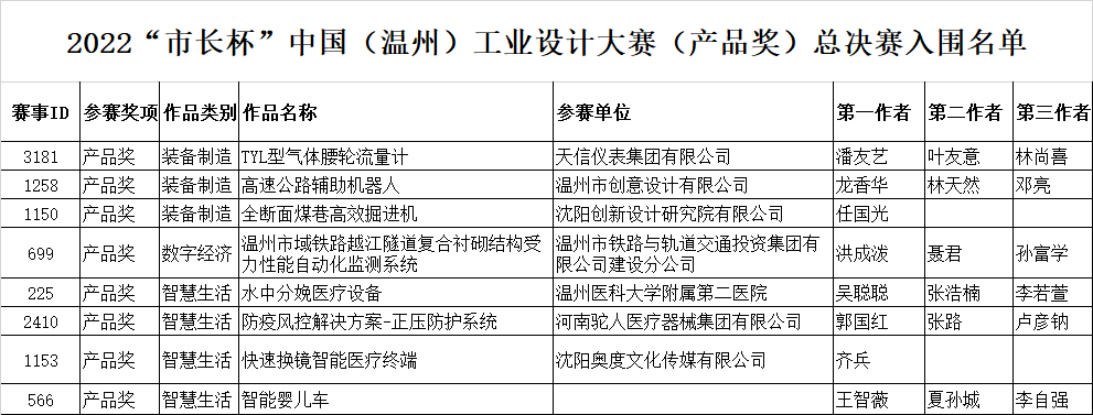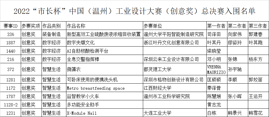经过专家评审,2022“市长杯”中国(温州)工业设计大赛决赛入围产品奖(8件)和创意奖(10件)作品名单正式公布,现将名单公示如下: