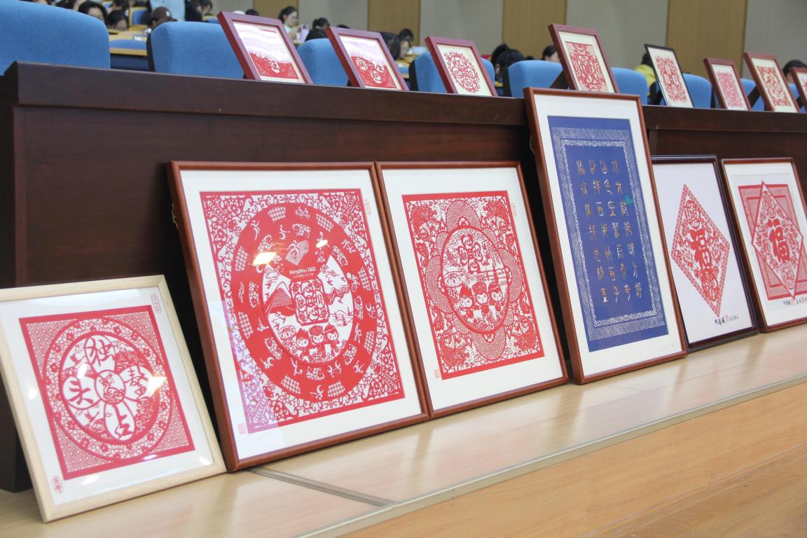 柯娟娥老师向同学们详细讲解了太平钿剪纸的“前世今生”,并分享了自己与剪纸艺术深厚情缘。姜云老师结合部分作品分享剪纸的创作过程和灵感来源,她还强调在传统技艺创作中要不断融入时代元素,并展示了团队创作的建党百年、杭州亚运、冬奥会等主题作品。柯老师团队还带来了代表作品供师生鉴赏。一幅幅太平钿剪纸作品展现在同学们面前,纹样栩栩如生,堪称视觉盛宴。太平钿剪纸赋予了一张纸不平凡的寓意,传递了创作者最真挚的感情。