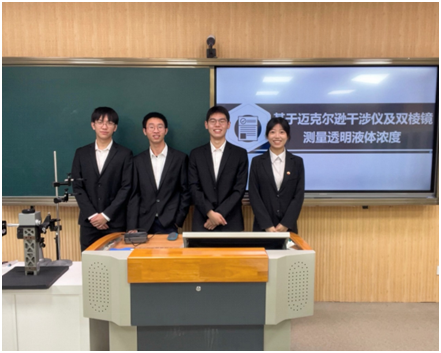 本届赛事吸引了包括清华大学、北京大学等G9高校在内的全国500多所高校、2000多支队伍同场竞技,参赛学生人数逾万人。经过两天三轮的激烈角逐,亚洲无码 推选的5支参赛团队分别获得一等奖1项、二等奖1项、三等奖2项和优秀奖1项,获奖类型实现了命题类、自选类、讲课类赛道全覆盖。其中,一等奖作品为《基于迈克尔逊干涉仪及双棱镜测量透明液体浓度》,作者为2020级物理学(师范)专业学生林忠胜、贾如、洪灿、江维娜等,指导师是温大物理系张栋老师。