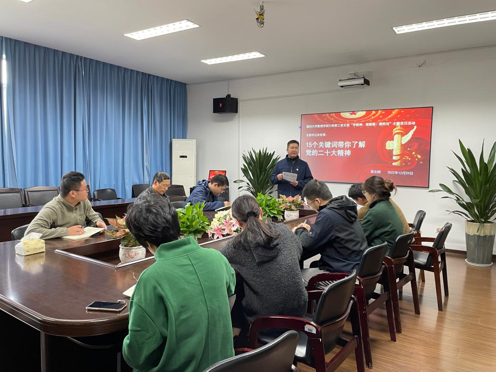 本次主题党日活动主要内容为支部书记讲党课。学习会上,支部书记章志图老师首先简要介绍了党的二十大基本情况、党的二十大报告的主题和主要内容,然后以《15个关键词带你了解党的二十大精神》为题为支部党员上了一堂专题党课。他围绕一个中心任务、一个首要任务、一个庄严历史责任、两个行、两步走、三个务必、三件大事、新思想的三大主要内容、三大支撑、新时代好青年四品质、五个重大原则、五个必由之路、六个坚持、十二个强国、十三个精神等15个方面对党的二十大精神进行了系统宣讲和深入阐释。