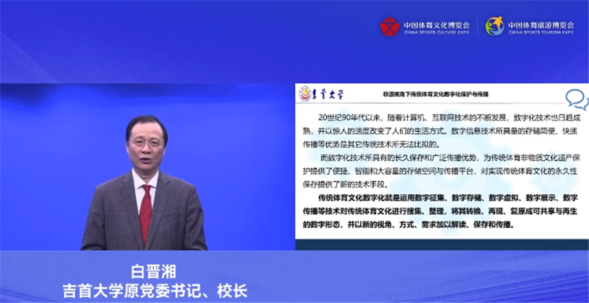 吉首大学原党委书记、校长白晋湘发表了《非遗视角下传统体育文化数字化保护与传播》的主题演讲。他分享到,传统的采访、记录、拍照、实物收藏等简单的资料收集方式,不能充分保存、传播和利用传统体育非遗。数字化技术所具有的长久保存和广泛传播的优势,为传统体育非物质文化遗产的保护提供了便捷、智能和大容量的存储空间,因此要利用数字技术对体育非遗进行长久保存并建立数据库等平台。