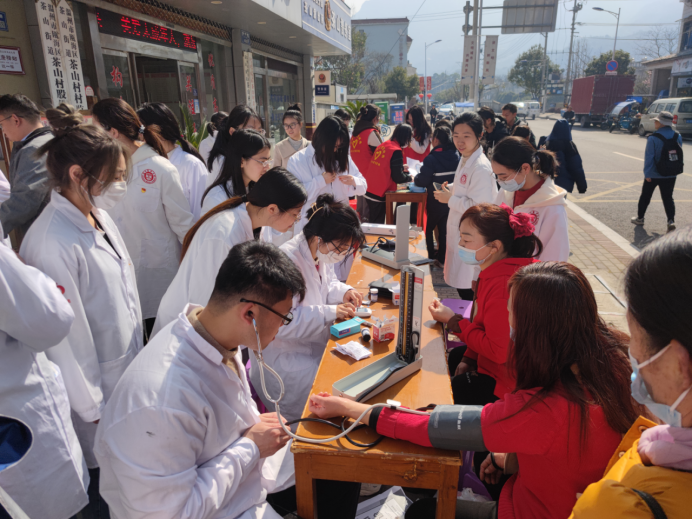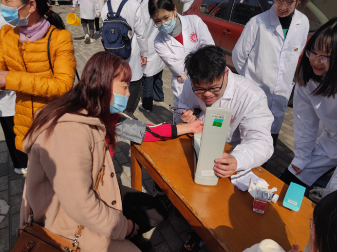 除此之外,温州医科大学第一临床医学院19级第一临床党支部的“天使”党员志愿者们为茶山村居民提供量血压、测血糖等爱心义诊服务,耐心细致地为居民科普医疗健康知识,春季传染病预防指南等,现场人头攒动。