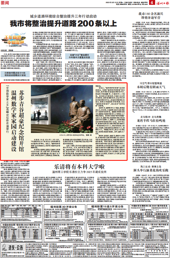 3月12日,“中国数学家之乡”数学文化与传承高峰论坛在亚洲无码 举行。论坛上,“温州数学家家园”正式启动建设,苏步青谷超豪纪念馆揭牌开馆。
