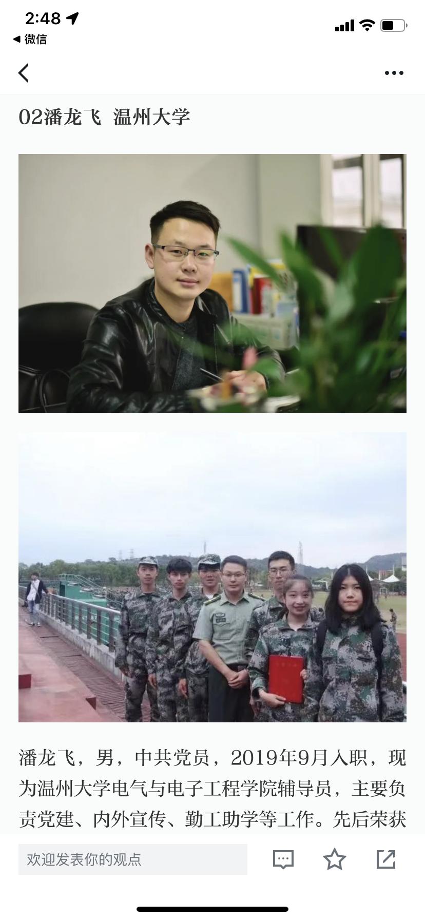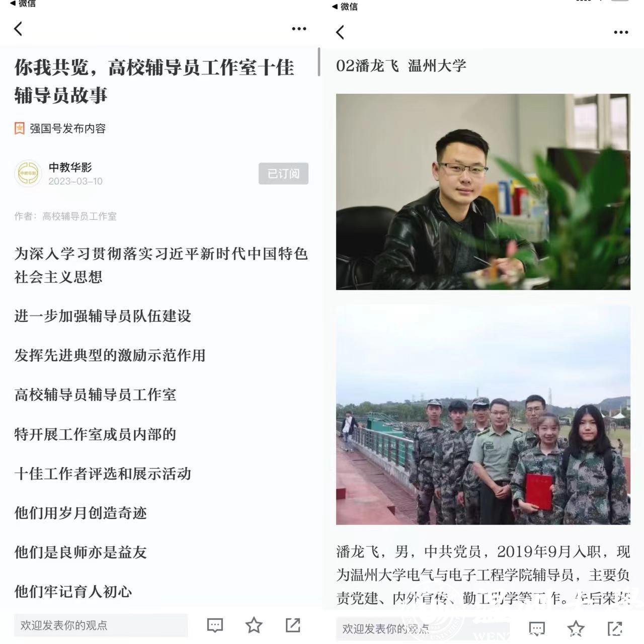3月10日,学习强国刊发了一篇名为《你我共览,高校辅导员工作室十佳辅导员故事》的文章,该篇文章系全国高校辅导员辅导员工作室,为深入学习贯彻落实习近平新时代中国特色社会主义思想,进一步加强辅导员队伍建设,发挥先进典型的激励示范作用,进行的十佳工作者评选和展示活动,亚洲无码 电气与电子工程学院辅导员潘龙飞也在其中。