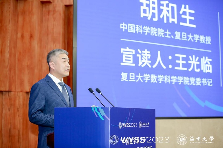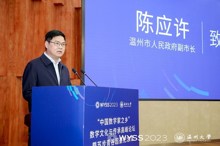 陈应许致辞。他代表温州市政府向院士、专家、来宾表示热烈欢迎,向长期以来关心和支持温州改革发展的各位领导、社会各界人士表示衷心感谢。他指出,温州素有“东南小邹鲁”之称,也是中国数学家的摇篮,被誉为“数学家之乡”。新时代,温州擦亮“数学家之乡”金字招牌是绵绵用力,久久为功,例如,打造了世界青年科学家峰会、中国数学教育研讨会、温籍数学家研究中心、温籍数学家长廊等多种平台,出台了《温州数学家家园建设方案》,充分发挥温籍数学家资源丰富的独特优势,加速引育一批国内外数学家等等。他在致辞中提出三点建议意见:一是汇聚最强大脑,助力温州加强数学基础研究;二是汇聚最强资源,助力温州加强数学人才的培养;三是汇聚最优人才,助力温州建设人才创新高地,希望得到院士、专家的帮助和支持,共同擦亮温州“数学家之乡”城市金名片。