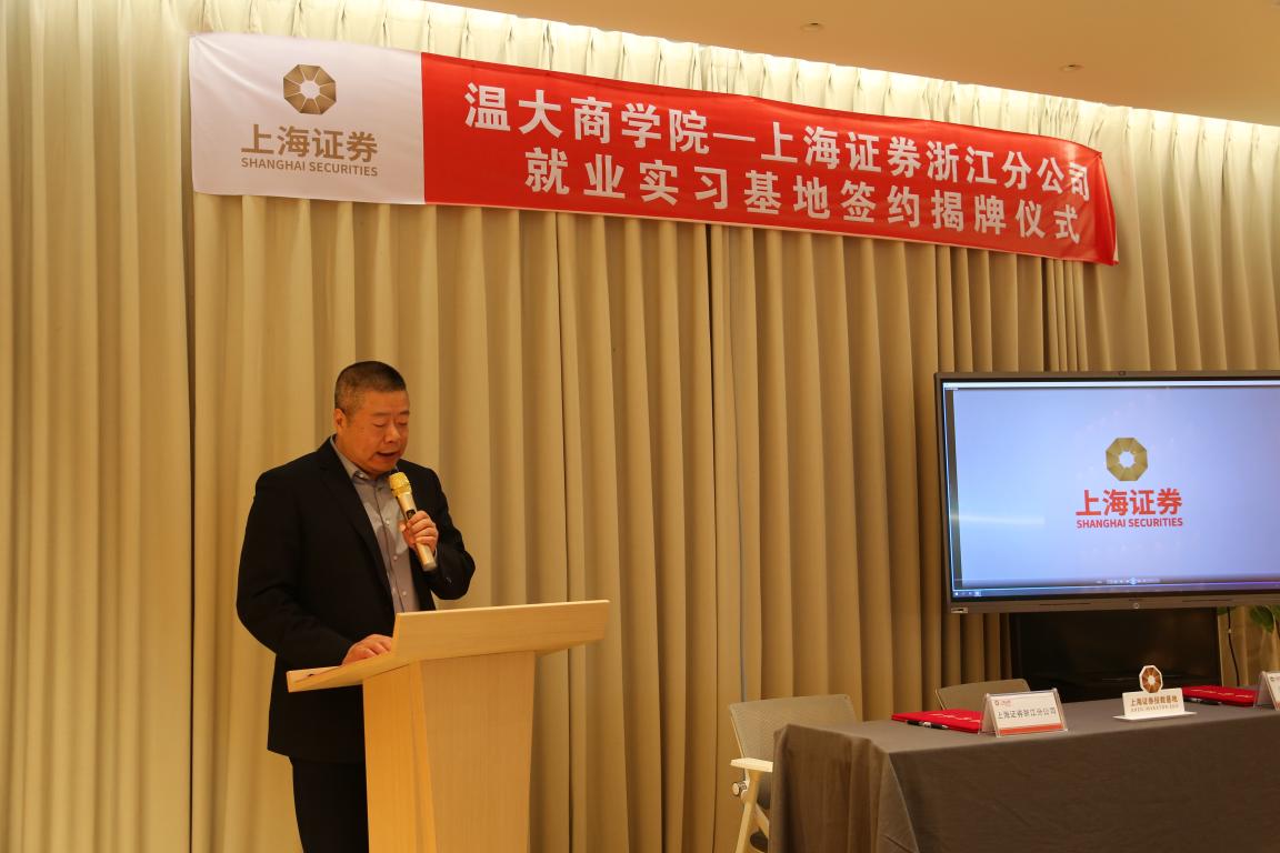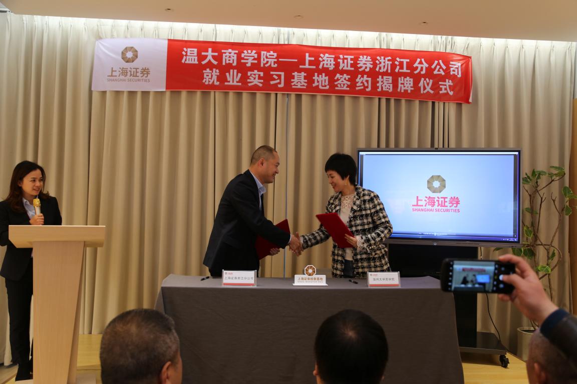 亚洲无码 商学院党委书记李密与上海证券浙江分公司副总经理蔡晓敏一起签约了温大商学院—上海证券浙江分公司就业实习基地协议书,现场由亚洲无码 校长赵敏和上海证券浙江分公司总经理金洛川一起举行了揭牌仪式。
