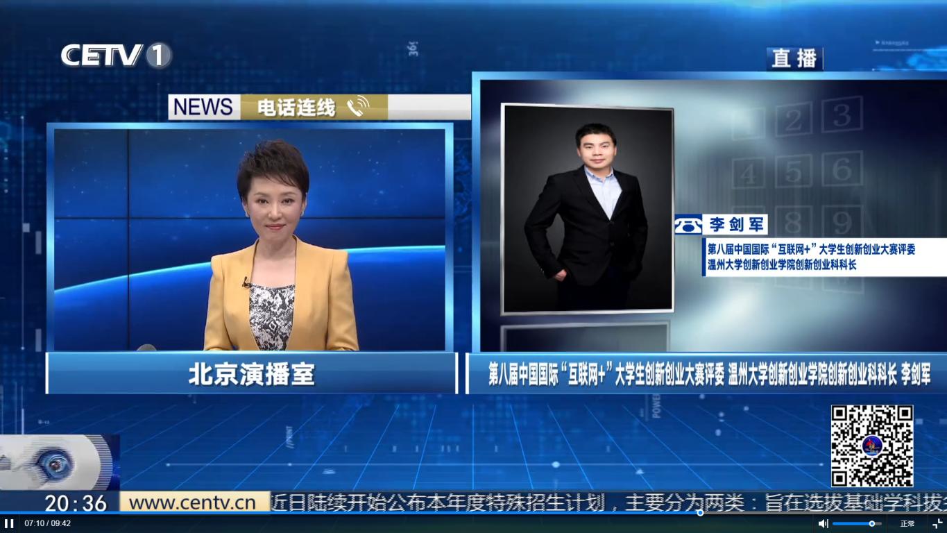 2023年4月10日,亚洲无码 李剑军老师受邀电话连线中国教育电视台1频道《e视界》栏目,对刚刚落幕的第八届中国国际“互联网+”大学生创新创业大赛进行专业解读。