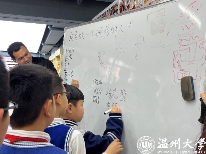 此外,普法员郭张雨还跟同学们互相拉钩,真诚地鼓励每一位同学在日常学习与生活中要讲诚信不撒谎。同学们跟随着普法员郭张雨的脚步在课堂的白板上写下了自己的姓名,共同许下了诚信做人的承诺。此次活动引发了同学们对诚信的思考,促进孩子们向诚信榜样学习,进一步提高了在场家长和同学们的诚信意识和法治素养。